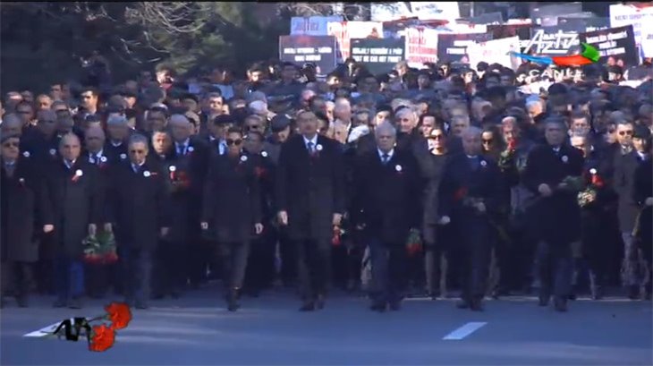 Saat 10:00 radələrində Azərbaycan prezidenti İlham Əliyevin iştirakı ilə dövlət nümayəndələri abidəni ziyarət ediblər. Ölkə başçısının iştirakı ilə Bakı Dəniz Vağzalının qarşısından başlayaraq "Ana harayı” abidəsi önünə izdihamlı yürüş keçirilib. AzətTAC prezident, vitse-prezident, nazir və komitə rəhbərlərinin də qatıldığı yürüşdə 40 mindən çox adamın iştirak etdiyi barədə məlumat verib. Yürüş iştirakçıları əllərində "Dünya Xocalı soyqırımını tanımalıdır!”, "Xocalıya ədalət!”, "Xocalını unutmayın!”, "Rədd olsun erməni faşizmi!”, "Xocalı - XX əsrin soyqırımı”, "Cinayətkarlar cəzasız qalmayacaqlar!”, "Xocalı soyqırımı - 25 il” və s. çağırışlar və şüarlar tutublar.