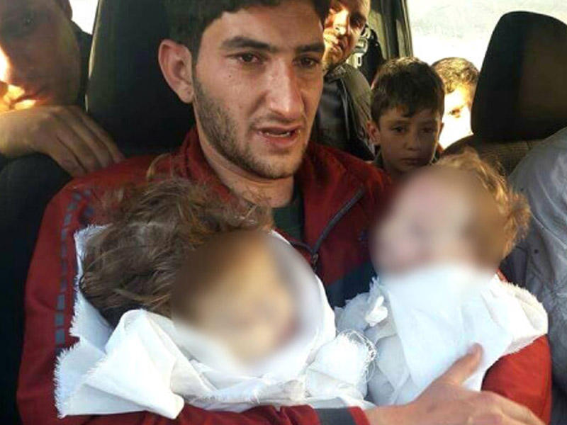 Suriyanın İdlib şəhərində ata kimyəvi bombalı hücum zamanı dünyasını dəyişən əkiz uşaqlarını öz əlləriylə torpağa tapşırıb.