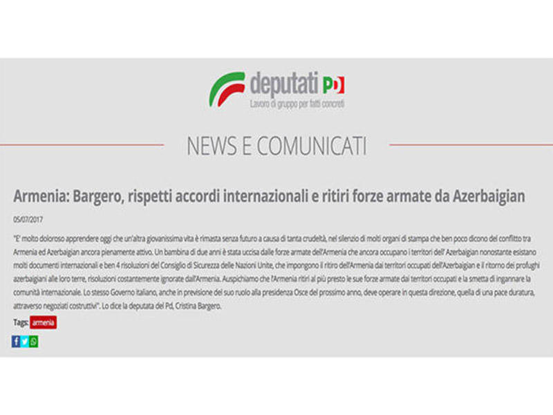 İtaliya parlamentinin Deputatlar Palatasının üzvləri Kristina Bargero və Xalid Çauki, habelə Senatın üzvü Vito Petroçelli Ermənistan silahlı qüvvələrinin iyulun 4-də təxribatı nəticəsində mülki azərbaycanlı əhaliyə qarşı törədilmiş cinayətləri pisləyən, eləcə də Ermənistanın işğalçı siyasətini qınayan bəyanatlar veriblər.