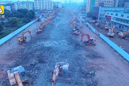 Çinin Nançan şəhərində 200 ekskavator bir gecə ərzində bir neçə metr uzunluqda olan estakadanı söküb.